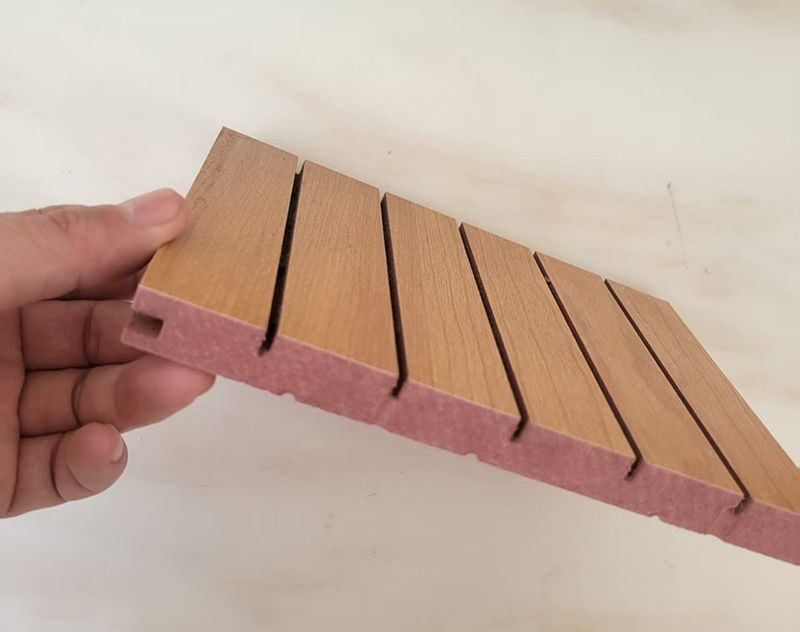 The acoustic panel features grooves and perforations on the surface, with an acoustic felt attached to the back. It is made from wooden materials and offers decorative effects. It can be used to eliminate indoor echoes and improve sound quality.