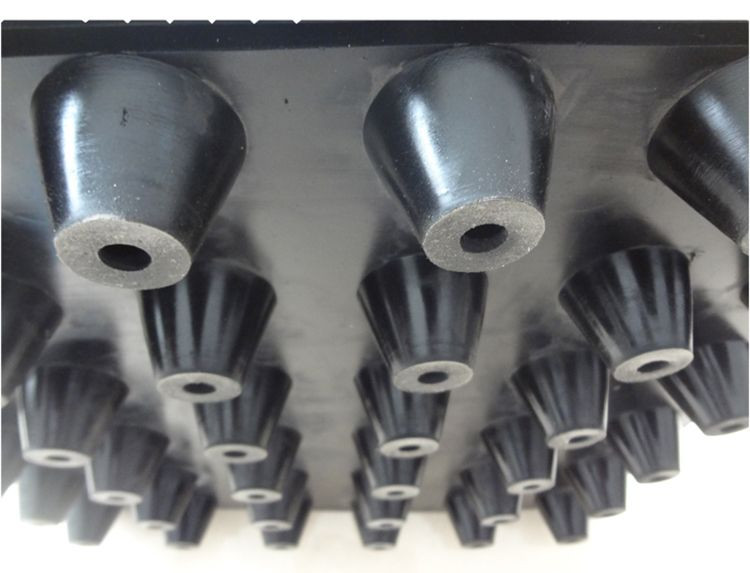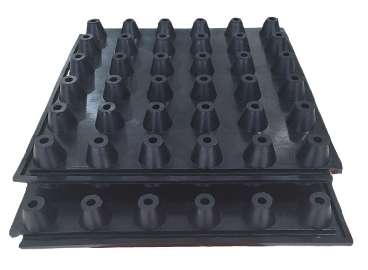 The rubber vibration damping and sound insulation pad is made of synthetic rubber through high-temperature vulcanization and compression molding. The raised protrusions with holes on the bottom side provide both air isolation and damping effects. It is mainly used for vibration isolation and sound insulation in floating floor layers and power equipment, effectively reducing the transmission of vibration and noise through building structures.