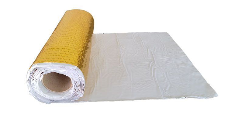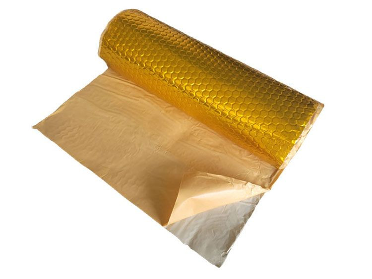Butyl rubber sound insulation material features a layer of aluminum foil on one side and a layer of release paper on the other side. The middle damping layer is self-adhesive. It can be used for vibration damping and sound insulation in automobiles and pipelines.